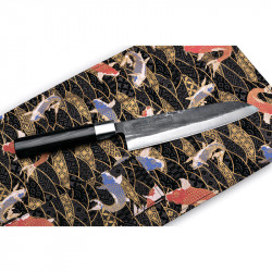 Nos encontramos ante una pieza original que destaca en cualquier cocina y que además viene en una presentación a la altura: Caja con grabados típicos japoneses y dentro la pieza en una funda de tela para acentuar el carácter típico oriental de este cuchillo.