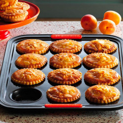 Este molde antiadherente de 12 cavidades no muy profundas se utiliza para hacer galletas, tartaletas, mantecados, mazapanes, pastelitos y otras variantes dulces y saladas. Se engrasan las cavidades o se utiliza papel de cocina para desmoldar después de hornear, fácilmente. Sus asas de silicona, aptas para hornos hasta 250º, facilitan el desmoldaje sin quemarse. Su revestimiento antiadherente no tiene PFOA.