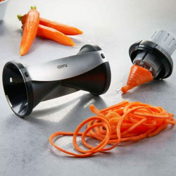 El sacapuntas de verduras o cortador en espiral de Gefu es un clásico, resistente y eficaz. Se utiliza como un sacapuntas: se introduce en uno de sus orificios una hortaliza, que se gira para convertirla en tiras de verduras. Puedes clavar la hortaliza en el protector de dedos, para convertirla en fideos al máximo de su capacidad.